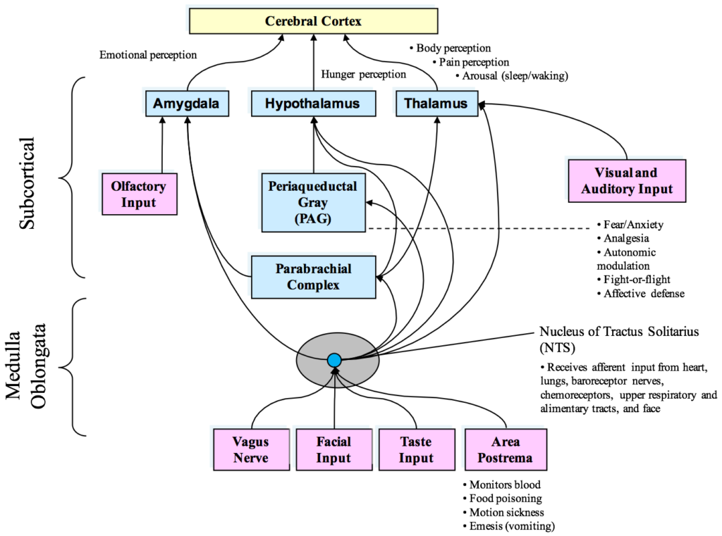 Figure 2. Diagram of the currently known afferent pathways by which information from the heart and cardiovascular system modulates brain activity. Note the direct connections from the NTS to the amygdala, hypothalamus and thalamus. Although not shown, there also is evidence emerging that there is a pathway from the dorsal vagal complex that travels directly to the frontal cortex