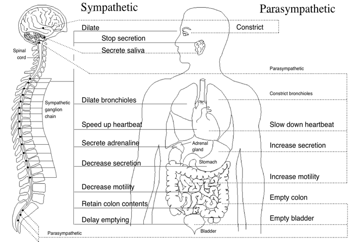 Figure 3. Innervation of the major organs by the autonomic nervous system (ANS). Parasympathetic fibers are primarily in the vagus nerves, but some that regulate subdiaphragmatic organs travel through the spinal cord. The sympathetic fibers also travel through the spinal cord. A number of health problems can arise in part because of improper function of the ANS. Emotions can affect activity in both branches of the ANS. For example, anger causes increased sympathetic activity while many relaxation techniques increase parasympathetic activity.