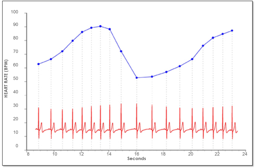 Figure 4. Heart rate variability is a measure of the normally occurring beat-to-beat changes in heart rate. The electrocardiogram (ECG) is shown on the bottom and the instantaneous heart rate is shown by the blue line. The time between each of the heartbeats (blue line) between 0 and approximately 13 seconds becomes progressively shorter and heart rate accelerates and then starts to decelerate around 13 seconds. This pattern of heart-rate accelerations and decelerations is the basis of the heart's rhythms.