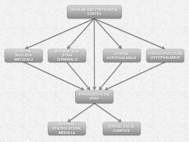 Figure 5. Schematic diagram showing the relationship of the principal descending neural pathways from the insular and prefrontal cortex to subcortical structures and the medulla oblongata as outlined by Oppenheimer and Hopkins.[43] The insular and prefrontal cortexes are key sites involved in modulating the heart's rhythm, particularly during emotionally charged circumstances. These structures alone with other centers such as the orbitofrontal cortex and cingulate gyrus can inhibit or enhance emotional responses. The amygdala is involved with refined integration of emotional content in higher centers to produce cardiovascular responses that are appropriate for the emotional aspects of "current" circumstances. Imbalances between the neurons in the insula, amygdala and hypothalamus may initiate cardiac rhythm disturbances and arrhythmias. The structures in the medulla represent an interface between incoming afferent information from the heart, lungs and other bodily systems and outgoing efferent neuronal activity.[43]