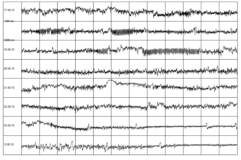 Figure 6. An example of the heart-rate tachogram, a plot of the sequence of time intervals between heartbeats over an 8-hour period in ambulatory recording taken from a 36-year-old male. Each of the traces is one hour long, with the starting time of the hour on the left-hand side of the figure. The time between each vertical line is 5 minutes. The vertical axis within each of the hourly tracings is the time between heartbeats (inter beat intervals) ranging from 400 and 1,200 milliseconds (label shown on second row). A 15-minute period of HRV coherence can be seen in the latter part of the hour, starting at 19:30 when this man used HeartMath's Heart Lock-In® Technique. The latter part of the hour, starting at 23:30, is typical of restful sleep.