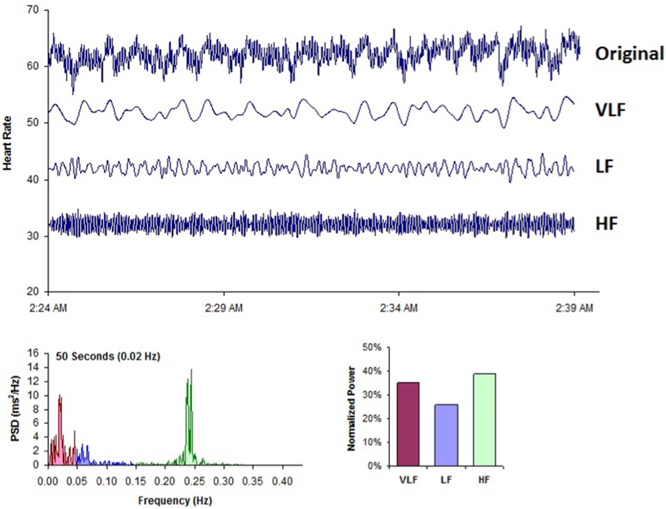 The very-low-frequency band (VLF) is the power in the HRV power spectrum range between 0.0033 and 0.04 hertz, which equates to rhythms or modulations with periods that occur between 25 and 300 seconds. Although all 24-hour clinical measures of HRV reflecting low HRV are linked with increased risk of adverse outcomes, the VLF band has stronger associations with all-cause mortality than the LF and HF bands.[24, 66-68] Low VLF power has been shown to be associated with arrhythmic death[69] and PTSD.[70] Additionally, low power in this band has been associated with high inflammation[71, 72] in a number of studies and has been correlated with low levels of testosterone, while other biochemical markers, such as those mediated by the HPA axis (e.g., cortisol), has not.[73] Longer time periods using 24-hour HRV recordings should be obtained to provide comprehensive assessment of VLF and ULF fluctuations.[74]