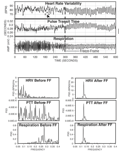 Figure 9. The top graphs show an individual's heart rate variability, pulse transit time and respiration patterns for 10 minutes. At the 300-second mark, the individual practiced Freeze Frame (a HeartMath technique) and all three systems came into entrainment, meaning the patterns were harmonious instead of scattered and out of sync. The bottom graphs show the spectrum analysis view of the same data. The left-hand side is the spectral analysis before using Freeze Frame. Notice how each pattern looks quite different from the others. The graphs on the right show how all three systems are entrained at the same frequency after using Freeze Frame.