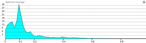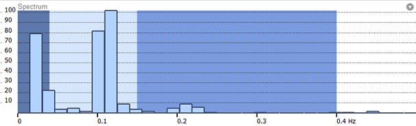 On a spectrum analysis graph, the frequencies (cycles) are represented by the number of times they repeat in one second. In our breathing example, one respiratory cycle was completed in 10 seconds. On a graph, this rhythm is converted to cycles per second (Hertz). A 10 second rhythm completes one-tenth (1/10) of a cycle per second, therefore the position of this event on the horizontal scale is at 0.1 (1/10 of a second), and the height, or amplitude, of the bar is determined by how deep the breath was. Faster breathing would position the spectral bar further to the right (shorter cycle), while a slower breath rate would move the spectral bar to the left (longer cycle).