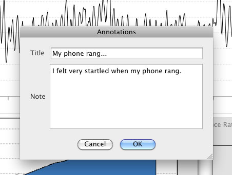 In the emWave Pro software you have the ability to add, edit and remove annotations to the HRV graph. Annotations can be added anywhere in your heart rhythm pattern. Each annotation can have a title and a note.