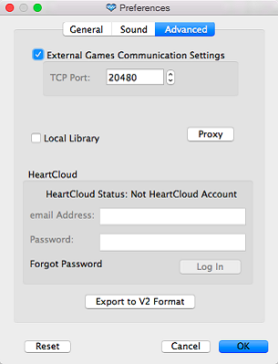 Advanced settings are found here. If your playing an external third party game you can enable TCP communication for that here. Also, if you find yourself logged out of HeartCloud, you may log back in here: