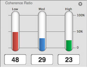 The coherence ratio graph is divided into three coherence levels: low, medium and high coherence. The total of the low, medium and high coherence scores will always equal 100%. The coherence ratio bars show how much time you have spent in low, medium and high coherence during your session. The goal is to improve your ratio in medium and high coherence. With regular practice, your ratio in high coherence will improve and your ability to remain coherent when not recording a session will increase.