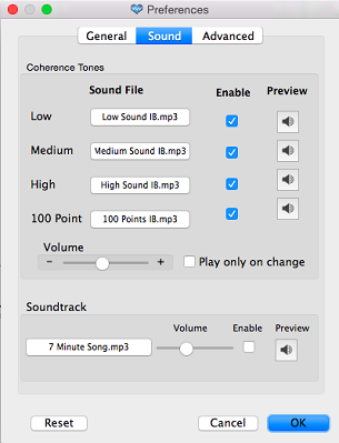 Here you can preview and select the sound files you want to play. You can also enable a soundtrack to play during your session. Most of the games play with music so these sounds will be muted when running a game. The My Inspiration Game can use a custom soundtrack. Click on the soundtrack icon, where the default soundtrack is 7 minute song.mp3 and browse your computer's music files until you find the song you are looking for. The music file must be in the MP3, WAV or WMA audio format to run. Click on it to load it into emWave. Once you have uploaded your song, click on the enable box and click Preview to confirm that the music will play. Once this is done, click on OK to close the menu. Alternatively, you can also play music in the background using another application (iTunes, Windows Media Player, etc.) without needing to use the emWave application to play the music.