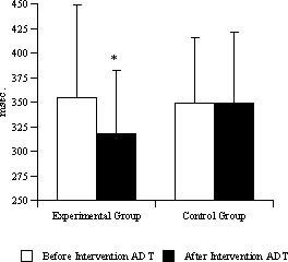 Reaction time changes. Mean reaction times for the experimental versus control group during the first (pre-intervention) and second (post-intervention) auditory discrimination tasks (ADT). The experimental group, who maintained the psychophysiological coherence mode prior to the second ADT, demonstrated a significant reduction in mean reaction time, indicative of improved cognitive performance. In contrast, control group participants, who engaged in an open-focus relaxation period during the interval between tests, showed virtually no change in mean reaction time from the first to the second discrimination task. *p < 0.05.