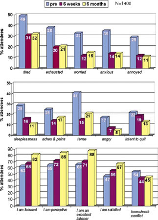 Psychological changes included significant reductions in overall psychological distress, anger, fatigue, hostility, global Type A behavior, speed and impatience, interpersonal sensitivity and increases in gratitude and positive outlook. There were also improvements in key organizationally relevant measures in the experimental group after the program, including significant increases in productivity, motivation, goal clarity and perceived manager support. Finally, the reduction in health risk factors achieved in this study are projected to lead to reductions in both healthcare and absentee costs, yielding a total projected annual cost savings of $699 per employee.