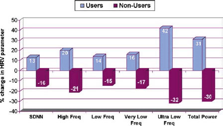 The figure below shows the average changes in HRV from 59 high-level executives at global companies over an eight-week period. The HRV data was collected over a 24-hour period from a group who learned and used HeartMath tools and emWave system, and a group who did not. The SDNN is a measure that reflects the overall amount of HRV one has over a 24-hour period. As can be seen in the graph, the executives who used the tools and emWave PC had a 13% increase in their HRV, while the other group’s overall HRV was reduced by 16%.