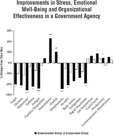 Measures of personal and organizational quality (POQA) in the trained employees were compared to those of a 64-member comparison group who had not received the training. After completion of the training, seven weeks from the initial assessment, the study group demonstrated significant reductions in measures of stress and negative emotion and significant increases in measures of positive emotion and organizational effectiveness compared to the untrained group. There were significant decreases in anger, 20%; distress, 21%; depression, 26%; sadness, 22%; and fatigue, 24%. There were significant increases in peacefulness, 23% and vitality, 10%. There was also a reduction in stress symptoms, including anxiety, 21%; sleeplessness, 24%; and rapid heartbeats, 19%. Organizational quality assessment revealed significant gains in goal clarity, 9%, and productivity, 4%. These changes were noteworthy in light of the major organizational and emotional challenges faced by the participants and the relatively short time in which the improvements took place.