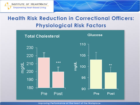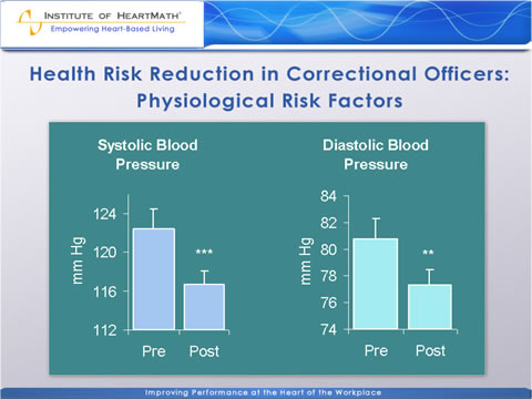 This study investigated the impact of HeartMath’s Power to Change Performance stress and health risk reduction program and emWave system practice on physiological and psychological stress and health risk factors in a sample of correctional officers. Eighty-eight officers from three facilities were randomly assigned to an experimental group and a wait-list control group. The program included instruction on health risk factors as well as training in positive emotion-focused stress-reduction techniques intended to reduce negative emotional arousal, improve physiological balance, increase positive effect and enhance performance. Learning and practice of the techniques was enhanced by heart-rate-variability feedback, which helped participants learn to self-generate physiological coherence, a beneficial mode associated with increased efficiency and synchronization in the functioning of physiological systems. Measures of physiological and psychological stress and health risk were assessed before the program and again three months after it concluded. The measures included in the health risk assessment were the Personal Wellness Profile self-report survey, which assesses a broad range of health-related information, behaviors and attitudes and the following four biometric markers: height, weight, blood pressure and total cholesterol levels. Additional measures reflective of physiological stress and overall health included cortisol and DHEA, secretory immunoglobulin A – an immune-system marker – HDL and LDL cholesterol, triglycerides, fasting glucose levels, a 10- minute resting electrocardiogram and measures of heart-rate variability – an indicator of autonomic function. Three self-report psychological surveys also were included to assess emotional stress and work-related variables.