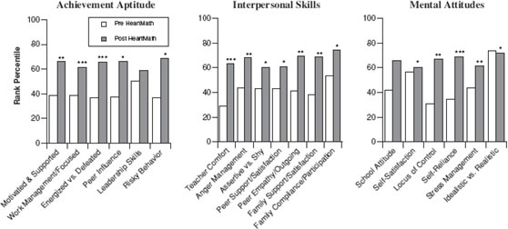 - Results showed that after learning and practicing the HeartMath tools, the students exhibited statistically significant improvements in 17 of the 19 areas assessed. These included a marked reduction in risky behaviors and improvements in stress and anger management, self-reliance, motivation, work management and focus, and relationships with teachers, family and peers (see figure below).