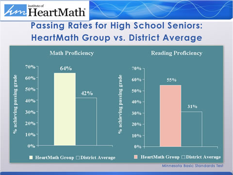 - The students’ passing rates on the exams also improved substantially. Of the HeartMath trained students retaking the math test, 64% passed, compared to 42% for all seniors in the district retaking the test at that time. The trained group’s passing rate was 55% in reading, compared to 31% for the district.