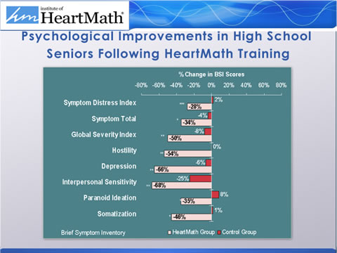 - Compared to a control group of 20 untrained students, the HeartMath-trained students also demonstrated significant improvements in emotional well-being following the program, as measured by the Brief Symptom Inventory. Improvements included significant reductions in hostility, depression, interpersonal sensitivity – feelings of personal inadequacy inferiority and self-doubt – physical symptoms stemming from stress and global indices of distress (see figure below).