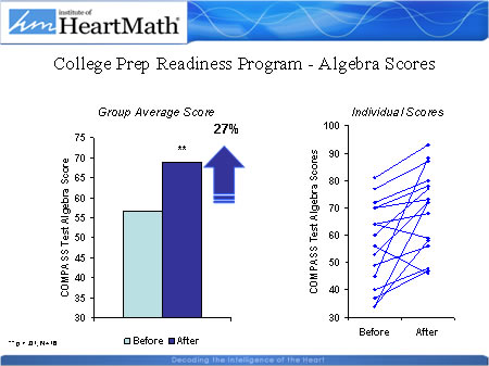 - Results show a statistically significant average increase of 27% in student scores on the college placement test in algebra after practicing HeartMath in their math class.