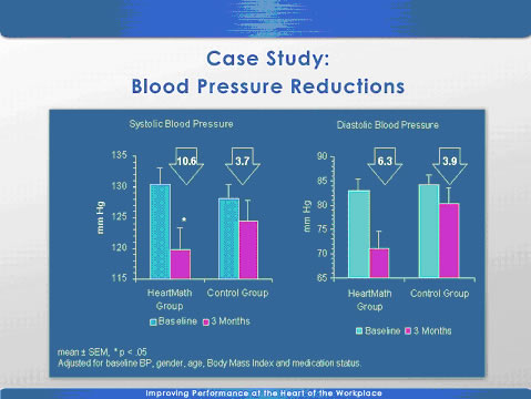 The employees, who had participated in the HeartMath program, had a mean adjusted reduction of 10.6 mm Hg in systolic BP and of 6.3 mm Hg in diastolic BP, compared to reductions of 3.7 mm Hg systolic BP and 3.9 mm Hg diastolic BP in the control group. When compared with the control group, the HeartMath group also exhibited significant reductions in symptoms of depression and overall psychological distress, as measured by the brief symptom inventory (BSI). The Personal and Organizational Quality Assessment also revealed reductions in stress symptoms along with improvements in emotional health and psychosocial functioning.