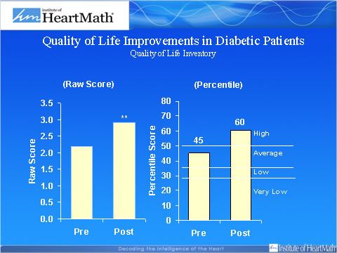 Diabetic patients demonstrated significant reductions in psychological distress and enhancement of quality of life after using the HeartMath interventions for six months. Increased practice of the Heart Lock-In® technique was associated with HbA1c reductions in patients with Type II diabetes, indicating improved glucose regulation.